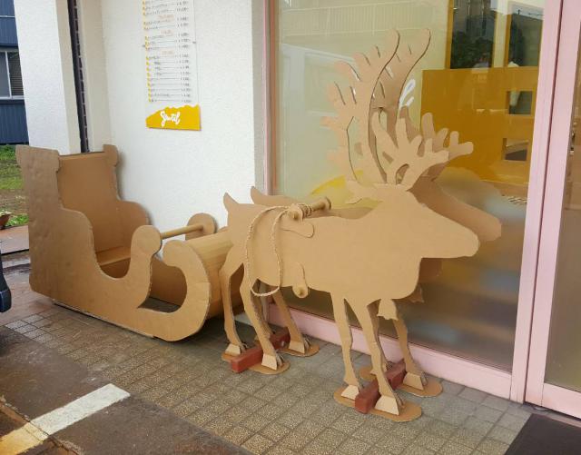 今年は《段ボールアート》に挑戦してみました! 板段ボールを買ってまずトナカイの絵を描いて、切って重ねて貼りつけて組み立てて・・・段ボールを切ったり、バランスとか思っていたより手間のかかる作業。雪像の時もそうですが、ジャンティ男子×2は凝りだすととことんこだわる2人なわけで、写真では見えない所もテキトーとかは一切なし!!ソリはちゃんと座れる様になっています。サンタを乗せようか思案中。先日は幼稚園生が座って写真撮ってくれていました。